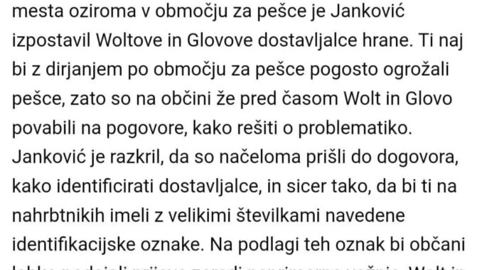 Župan Ljubljane Zoran Janković je pred kratkim izjavil, da smo dostavljalci hrane “najbolj prereč problem v mestnem središču”. Rekel je, da vozimo prehitro in ogrožamo pešce. Zaradi tega se je srečal z našimi šefi iz firm Glovo in Wolt, in skupaj so prišli do briljantne odločitve: “dajmo dostavljalcem na hrbte prilimati cifre, da jih bodo ljudje lahko prijavljali!” Odločiti se morajo samo še o tem, kakšne kazni nam bodo namenila podjetja.