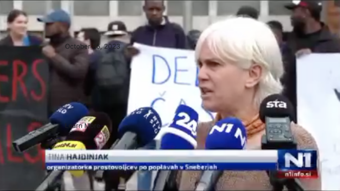 Ganljiv nagovor Tine Hajdinjak, koordinatorke prostovoljcev v Sneberjah, ki so pomagali pri odstranjevanju posledic uničujočih poplav v avgustu. O vlogi prostovoljcev – prosilcev za azil pri sanaciji je spregovorila na tiskovni konferenci 10.oktobra 2023 pred Državnim zborom.